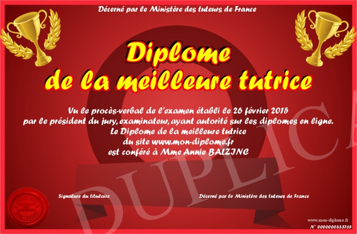 Envoyez par email votre Diplôme de la meilleure tutrice personalisé