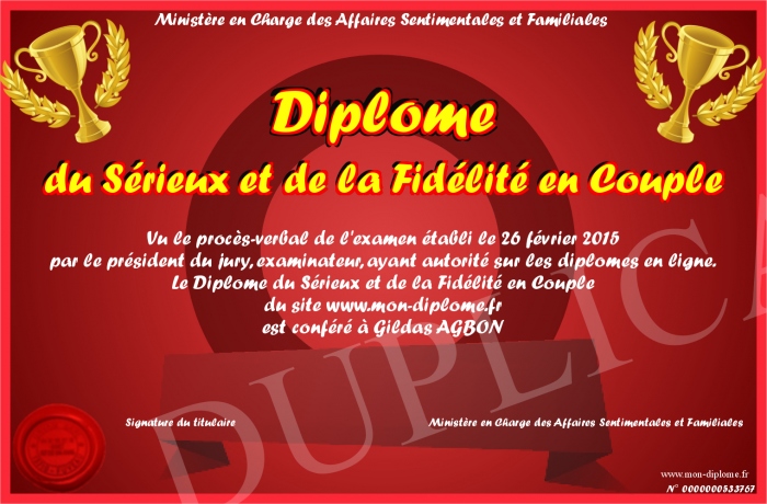 Envoyez par email votre Diplôme du Sérieux et de la Fidélité en Couple personalisé