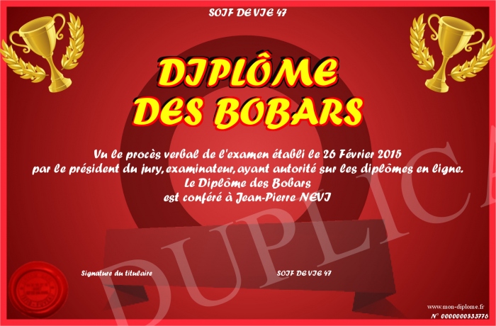 Envoyez par email votre DIPLÔME DES BOBARS personalisé