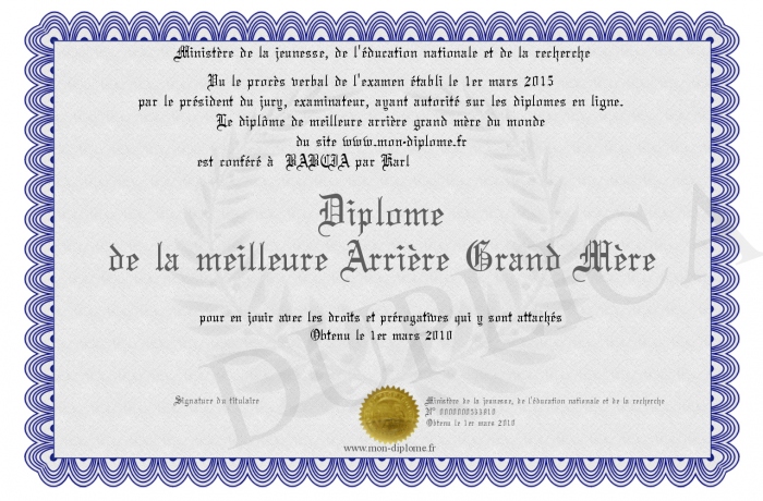 Envoyez par email votre Diplôme de la meilleure Arrière Grand Mère personalisé