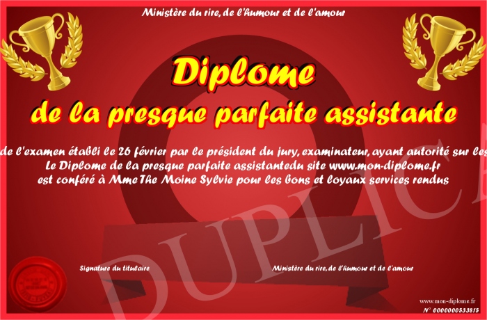 Envoyez par email votre Diplome de la presque parfaite assistante personalisé