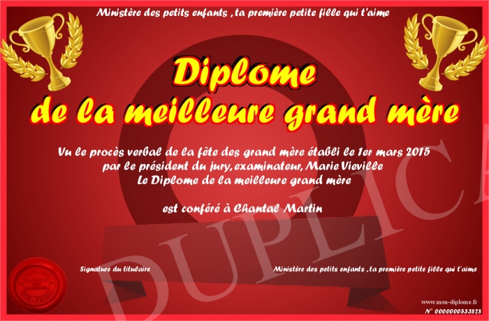Envoyez par email votre Diplôme de la meilleure grand mère personalisé