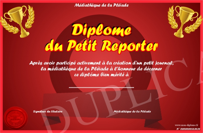 Envoyez par email votre Diplôme du Petit Reporter personalisé