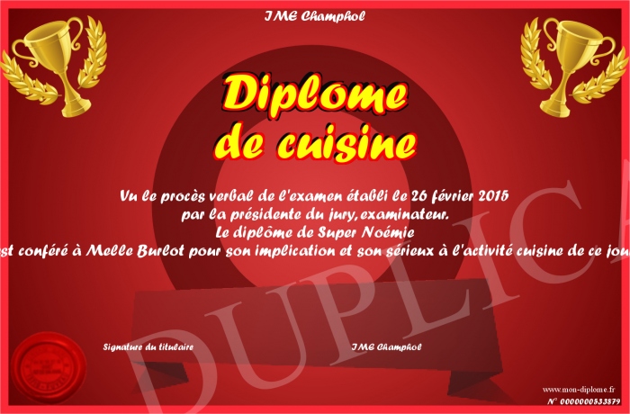 Envoyez par email votre Diplôme de cuisine personalisé