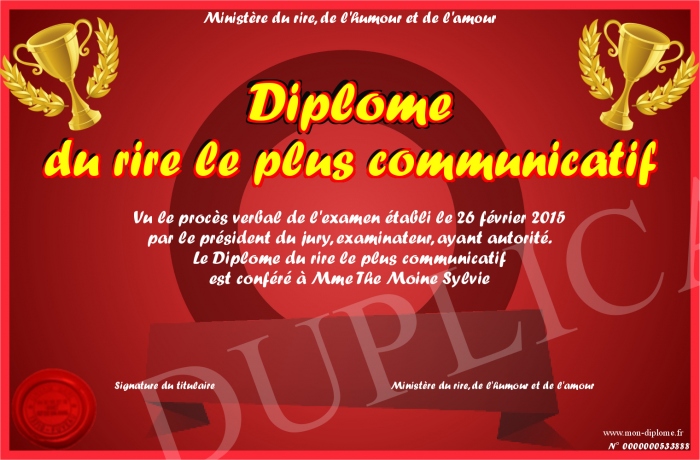Envoyez par email votre Diplome du rire le plus communicatif personalisé