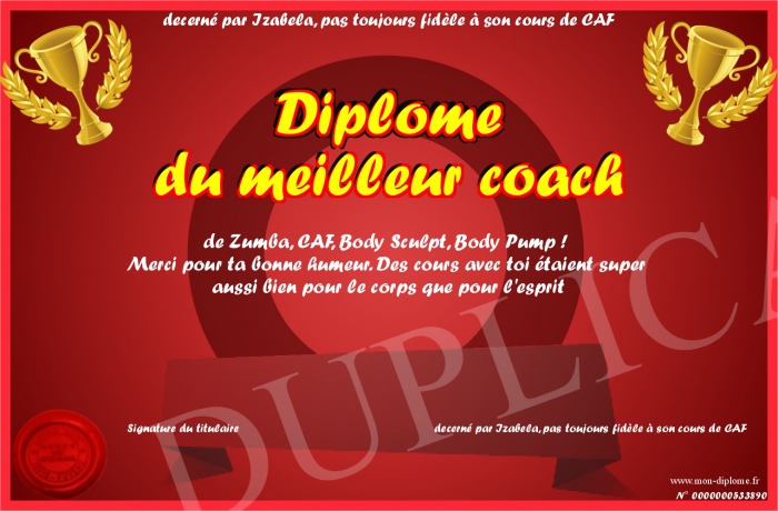 Envoyez par email votre Diplôme du meilleur coach personalisé