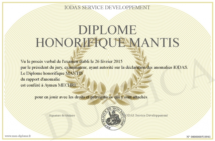 Envoyez par email votre Diplôme honorifique MANTIS personalisé