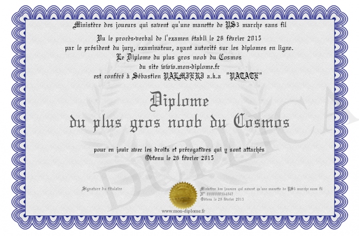 Envoyez par email votre Diplôme du plus gros noob du Cosmos personalisé