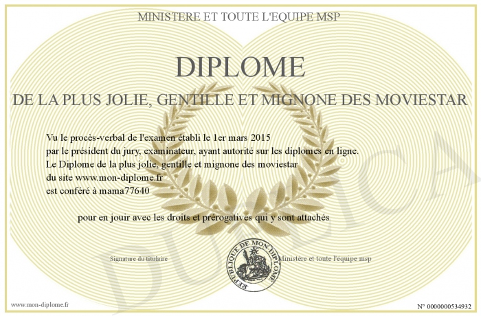 Envoyez par email votre Diplome de la plus jolie, gentille et mignone des moviestar personalisé