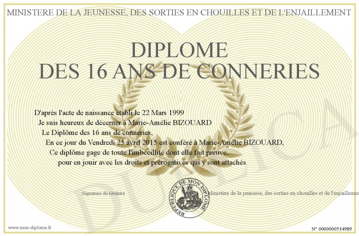 Envoyez par email votre Diplôme des 16 ans de conneries personalisé