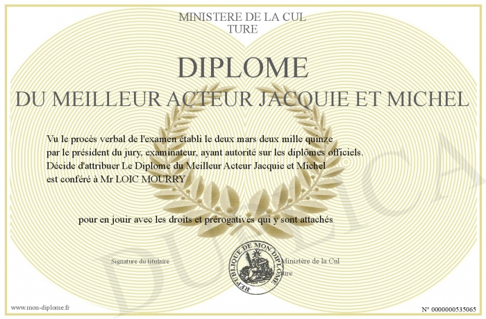 Envoyez par email votre Diplôme du Meilleur Acteur Jacquie et Michel personalisé