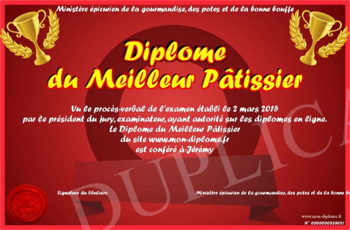 Envoyez par email votre Diplôme du Meilleur Pâtissier personalisé