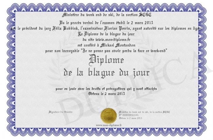 Envoyez par email votre Diplôme de la blague du jour personalisé