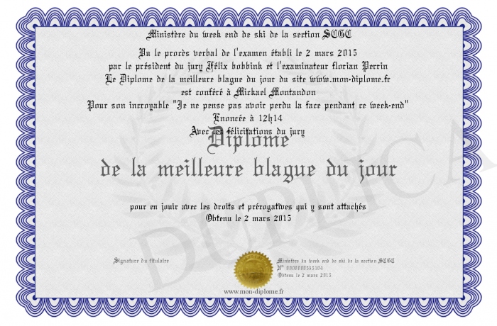 Envoyez par email votre Diplôme de la meilleure blague du jour personalisé