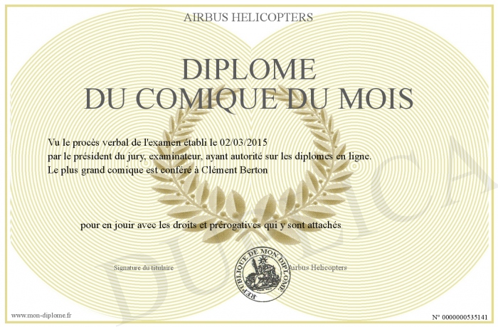 Envoyez par email votre Diplôme du comique du mois personalisé