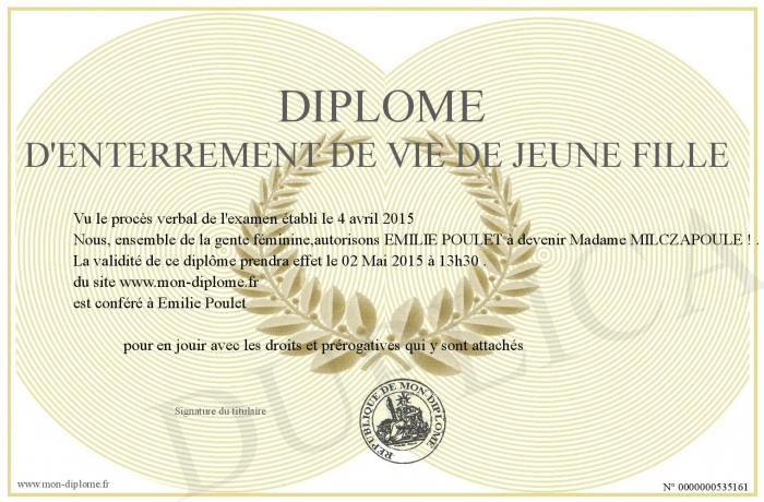 Envoyez par email votre Diplôme d'enterrement de vie de jeune fille personalisé