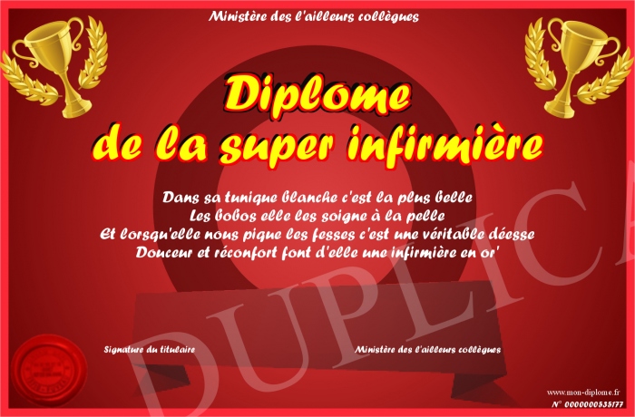 Envoyez par email votre Diplôme de la super infirmière personalisé
