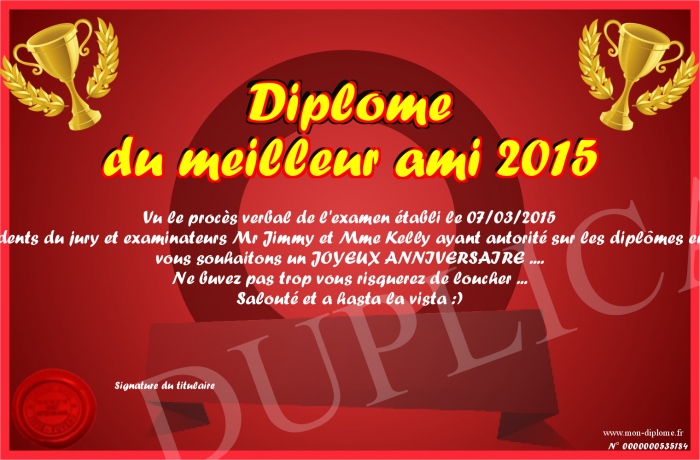 Envoyez par email votre Diplôme du meilleur ami 2015 personalisé