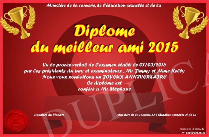 Envoyez par email votre Diplôme du meilleur ami 2015 personalisé