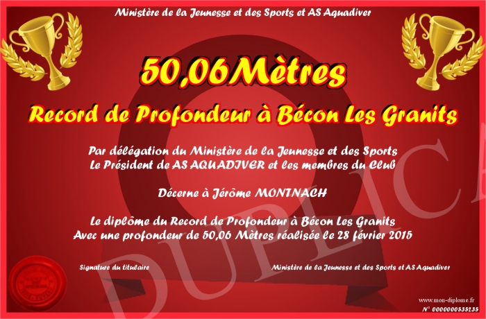 Envoyez par email votre 50,06Mètres Record de Profondeur à Bécon Les Granits personalisé