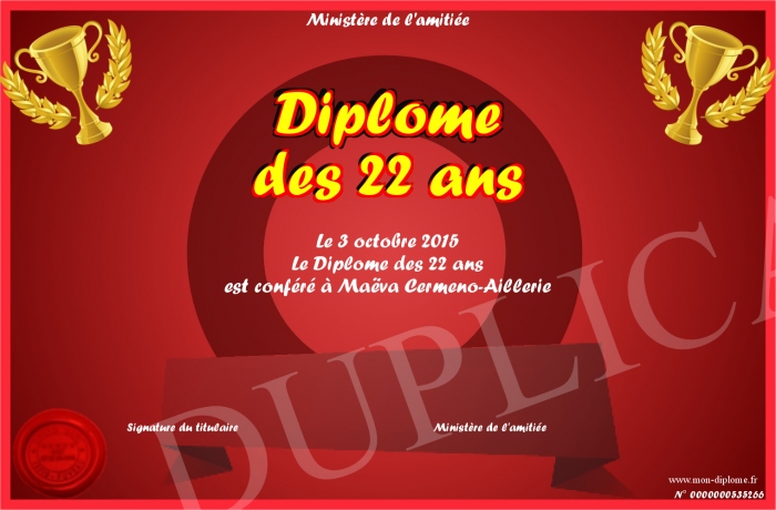 Envoyez par email votre Diplôme des 22 ans personalisé