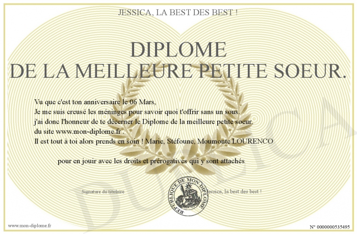 Envoyez par email votre Diplôme de la meilleure petite soeur. personalisé