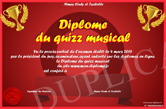 Envoyez par email votre Diplôme du quizz musical personalisé