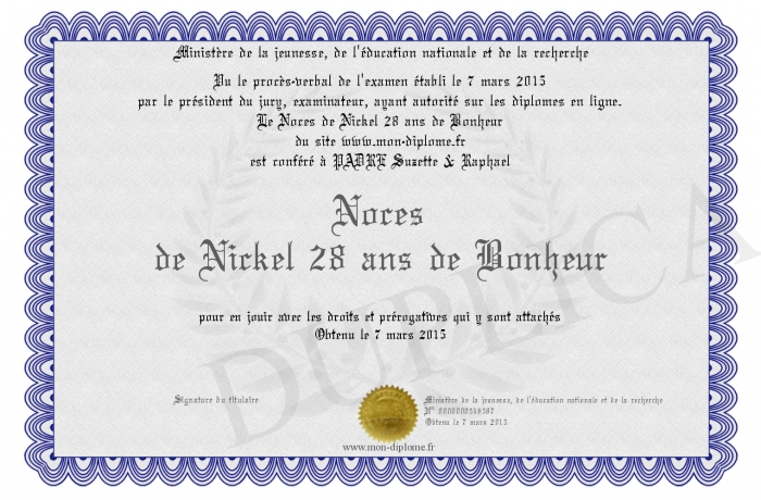 Envoyez par email votre Noces de Nickel 28 ans de Bonheur personalisé
