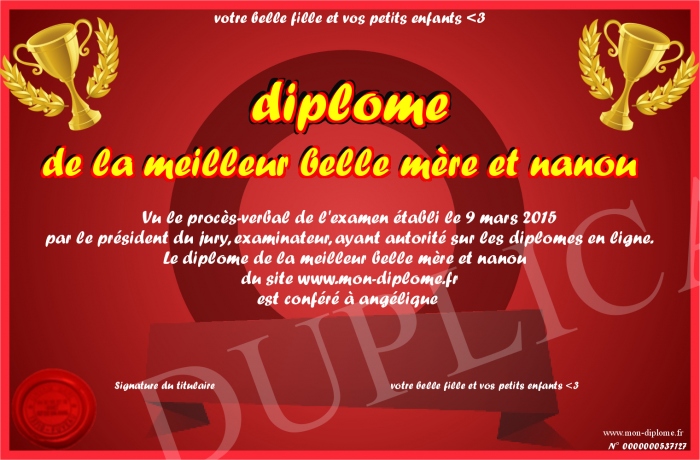 Envoyez par email votre diplôme de la meilleur belle mère et nanou personalisé
