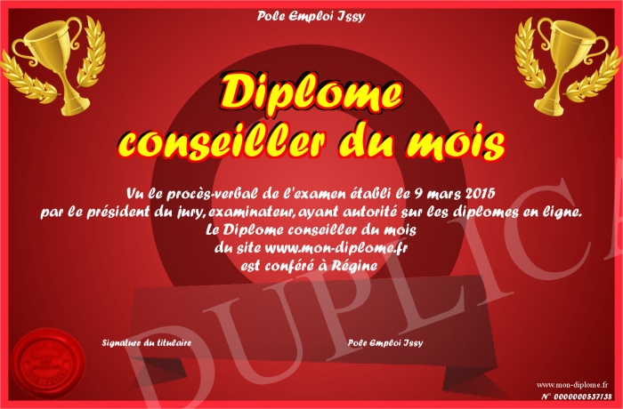Envoyez par email votre Diplôme conseiller du mois personalisé