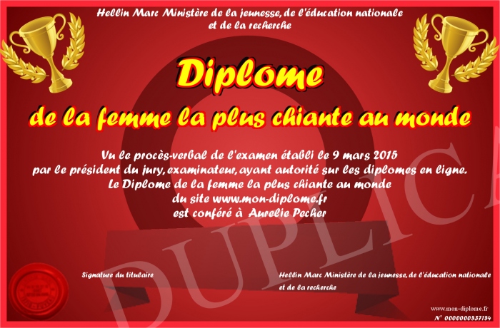 Envoyez par email votre Diplôme de la femme la plus chiante au monde personalisé
