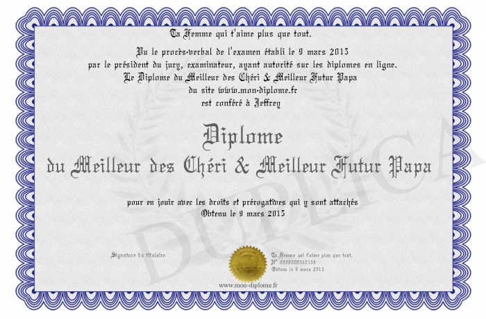 Envoyez par email votre Diplôme du Meilleur des Chéri & Meilleur Futur Papa personalisé