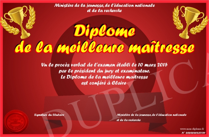 • Diplôme de la meilleure maîtresse