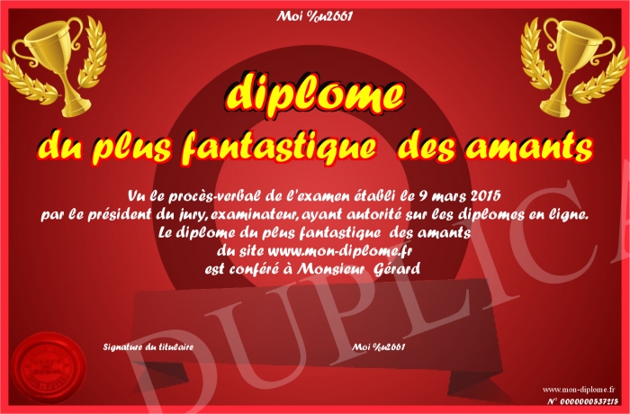 Envoyez par email votre diplôme du plus fantastique des amants personalisé