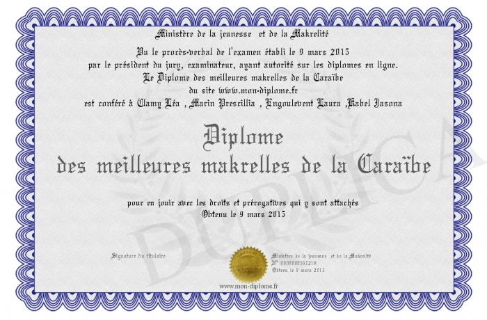 Envoyez par email votre Diplôme des meilleures makrelles de la Caraïbe personalisé