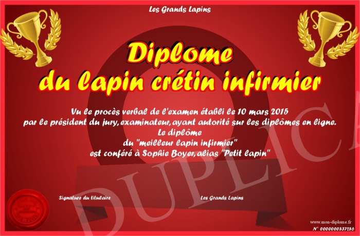 Envoyez par email votre Diplôme du lapin crétin infirmier personalisé