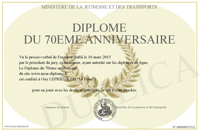 Envoyez par email votre Diplôme du 70ème anniversaire personalisé