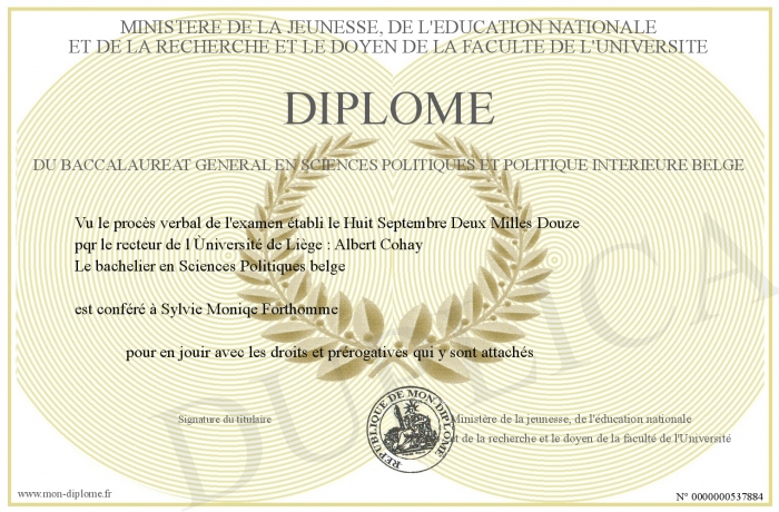 Envoyez par email votre Diplôme du baccalaureat général en Sciences politiques et politique intérieure belge personalisé