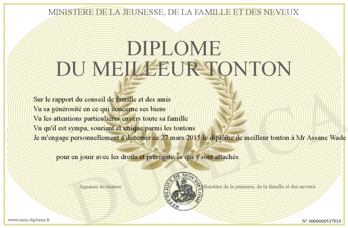 Envoyez par email votre Diplôme du meilleur tonton personalisé