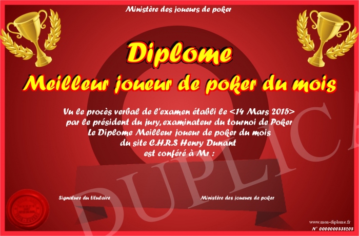 Envoyez par email votre Diplôme Meilleur joueur de poker du mois personalisé