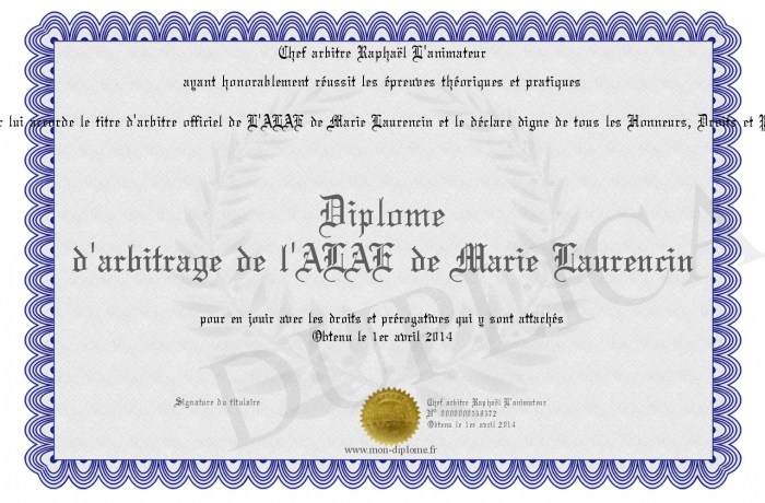 Envoyez par email votre Diplôme d'arbitrage de l'ALAE de Marie Laurencin personalisé