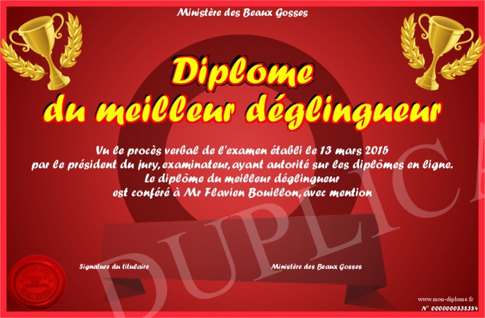 Envoyez par email votre Diplôme du meilleur déglingueur personalisé