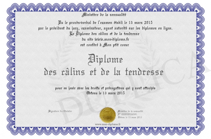 Envoyez par email votre Diplôme des câlins et de la tendresse personalisé