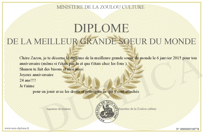 Envoyez par email votre Diplôme de la meilleur grande soeur du monde personalisé