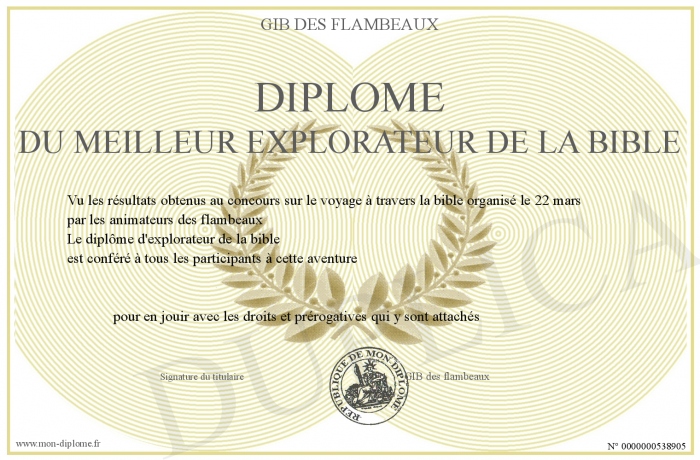 Envoyez par email votre Diplôme du meilleur explorateur de la bible personalisé