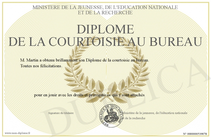 Envoyez par email votre Diplôme de la courtoisie au bureau personalisé