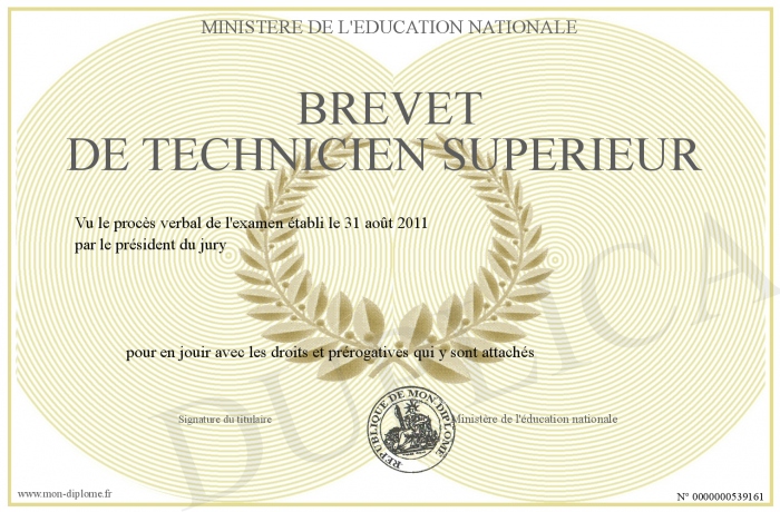 Envoyez par email votre Brevet de Technicien Supérieur personalisé