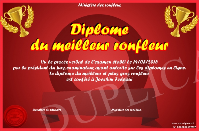 Envoyez par email votre Diplôme du meilleur ronfleur personalisé