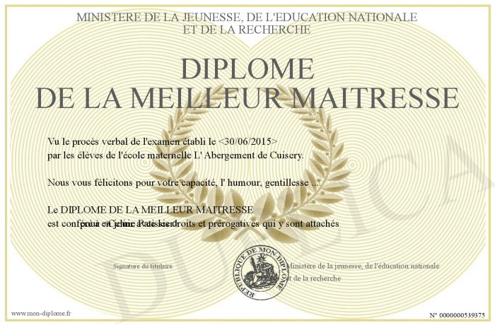 Envoyez par email votre DIPLOME DE LA MEILLEUR MAITRESSE personalisé