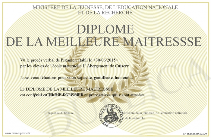 Envoyez par email votre DIPLOME DE LA MEILLEURE MAITRESSSE personalisé